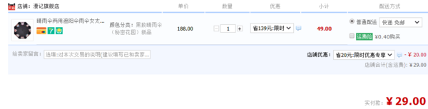 天猫旗舰店现价49元,可领取20元优惠券,券后实付29元包邮,铝合金伞柄结实抗风,高密度黑胶速干伞布可以隔热防晒,无论晴天还是雨天,都给你天空下最温柔的呵护。