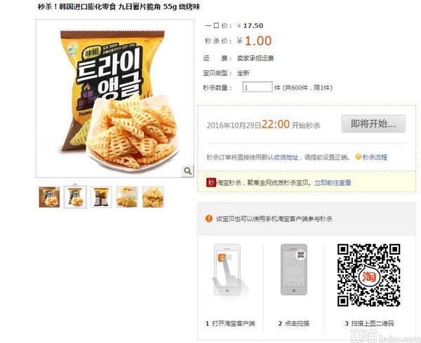 秒杀预告# 韩国进口 九日薯片脆角 55g 烧烤味 22点 1元包邮