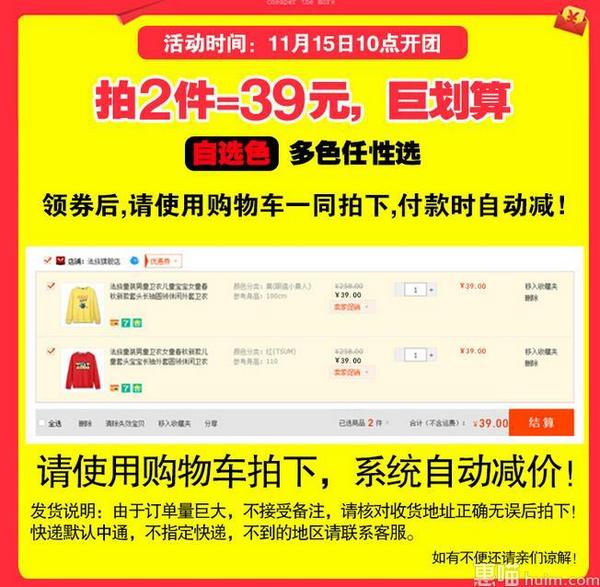 天猫旗舰店10点起售39元,下单2件,前10分钟拍下付款的朋友可享受买1送1优惠,拍下立减,实付39元包邮,折19.5元/件,加厚零甲苯,时尚亲子卫衣~