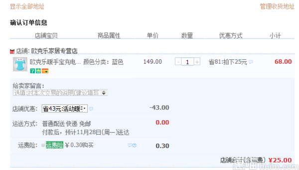 天猫专营店售价68元,拍下立减43元,实付25元包邮到手啦~