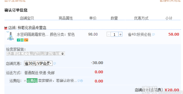 天猫专营店售价58元,可领取30元优惠券,券后实付28元包邮。