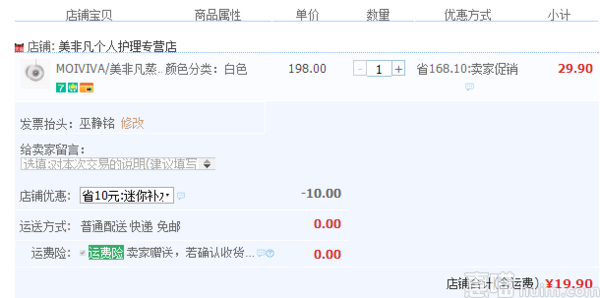 天猫专营店售价29.9元,可领取10元优惠券,券后实付19.9元包邮。
