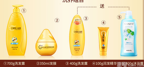 卡迪那是丹姿旗下品牌,套装包含洗发水700g+400g+发膜350ml+润发精华100g+沐浴露400g。沙龙级水疗素,修复填补受损发芯,锁紧水分,抚平毛糙,呵护秀发免受外界环境损伤,秀发丝润柔亮,强韧顺滑。