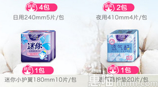 套装包含:日用5片*4包+夜用4片*2包+护翼10片+护垫20片。绵柔表层,触感轻柔,不移位,防变形,两侧加高棉栏,由内向外,层层透气,赶走闷潮黏湿,让大姨妈不再出轨!