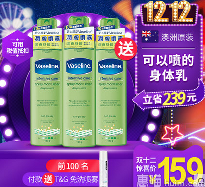 天猫海外旗舰店现售价198元,提前加入购物车,双12当天特价159元包邮,2瓶装,折79元/瓶,凡士林身体乳老牌子,很滋润哦!