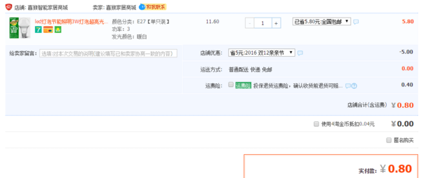 手慢无# 能普 led灯泡节能照明 3W 0.8元包邮(5.8-5券)