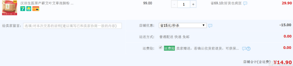 天猫旗舰店售价29.9元,可领取15元优惠券,券后实付14.9元包邮,一箱可泡脚100次哦~