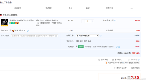 天猫旗舰店售价27.8元,可领取20元优惠券,券后实付7.8元包邮。