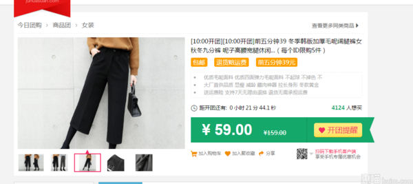 天猫旗舰店23日10点,原价59元的阔腿裤,前5分钟拍下并成功付款的喵友们,可享受39元包邮的优惠特价