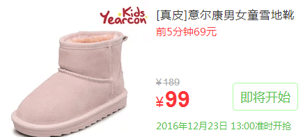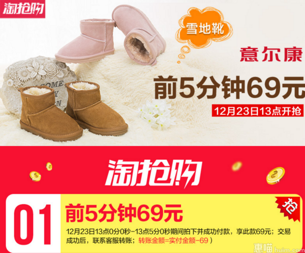 天猫意尔康童鞋旗舰店23日13点,原价69元的雪地靴,前5分钟成功拍下并付款的喵友们,可以找客服转账退差价,享受实付69元包邮的特价优惠哦。