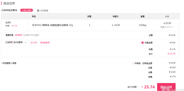 云猴网目前售价19元,使用1226大礼包中的6元优惠券,加税费邮费实付25.7元,很划算哦~