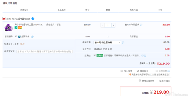 天猫专卖店售价299元,领取80元优惠券,实付219元包邮。