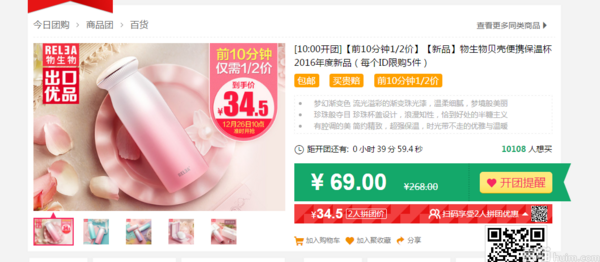 天猫旗舰店26日10点,原价69元的保温杯,前10分钟拍下并成功付款的喵友们,在确认收货后联系客服,可返现34.5元,即34.5元包邮到手。