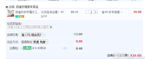 天猫专卖店售价39元,下单立减3元,再领10元券,实付26元包邮。还送护肤脂哦~