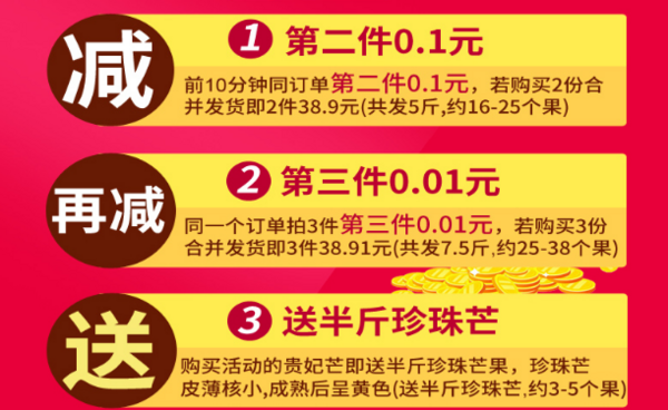 天猫旗舰店10点售价38.8元,第2件可享受0.1元优惠再送半斤珍珠芒,第3件可享受0.01元优惠,拍3件,实付38.91元,超值优惠哦~