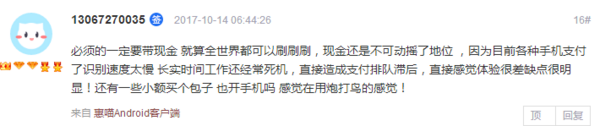 不少喵友都会选择带一点零钱防身,但是很多跟小编一样都是放着到现在也没有花出去。确实现在移动支付的技术应用已经相当广泛了,街边的i小贩都有了自己的收款码。不过也确实会遇到写问题,信号不好、手机卡顿、等待支付的人多等等也会造成时间上的浪费、体验感不佳。总之支付方式多样化,选择让自己舒服的方式就好啦。今天的优评在截图里咯,请注意查收奖励的金币哈~~
