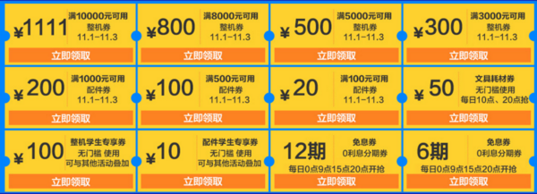 其中学生群还特别贴心的设置有100元无门槛专享券和10元无门槛配件专享券, 优惠券有效期为11月1日-11月3日,力度很少蛮不错的,需要的朋友可以先领取优惠券,