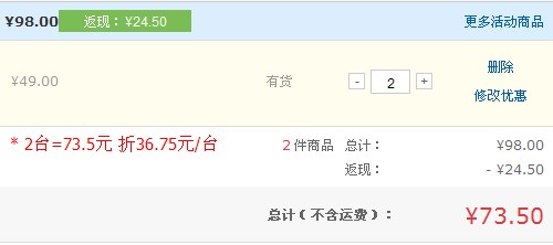 京东商城目前49元在售(部分地区缺货),还可参加满2件享75折优惠,入2台的话可低至36.75元/辆,对比其他商城89~129的价格优势算很明显了,临近儿童节,买来送给小孩子也是很合适的。