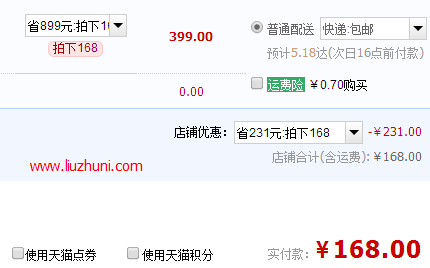 天猫商城399元在售,拍下到购物车立减231元,实付168元包邮到手,刷新全网历史新低价了,之前唯品会的199已经很便宜了,这次的话就更加无敌了!