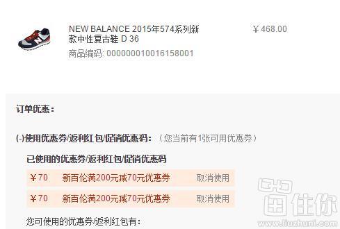 NEW BALANCE 2015年574系列新款中性复古鞋,目前468元,本身就是7.6折了,然后还支持使用两张200-70的优惠券,实付328元包邮到手,必须好价格啊,还是15年款式的!搜了下日常要600。