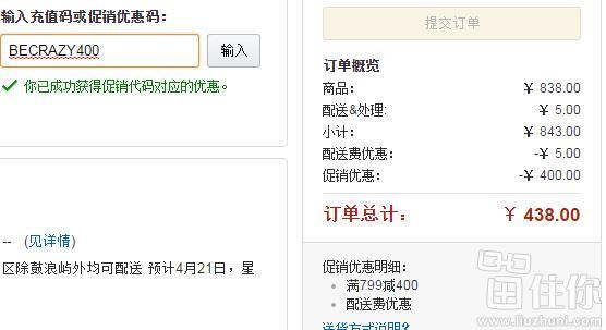 亚马逊目前838元在售,竟然可以参加799-400的满减活动,结算的时候留住你朋友们输入优惠码:“BECRAZY400”,即可减免400,实付418元包邮到手;