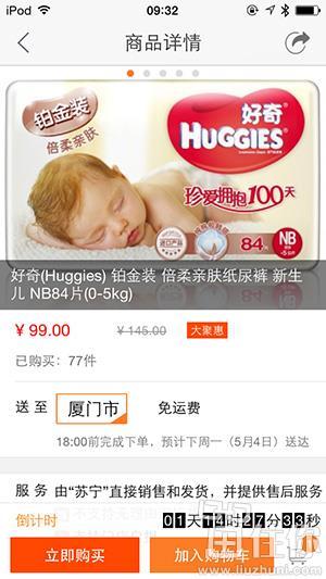 苏宁易购手机客户端好奇铂金装NB84片和铂金装S76片都是99元,再到好价,近期有需求的朋友可以购入。可在电脑端加入购物车,同步到手机客户端结算,也可用苏宁客户端扫描二维码购买。