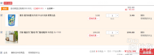 京东目前199元在售,可凑单康涤 强效除菌洗衣液200g补充装3.9元,拍下后即可立减80元,实付123元包邮,性价比不错;