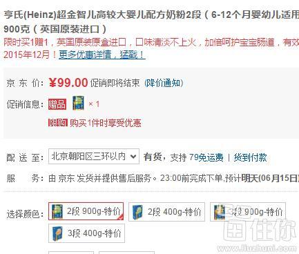 2.5折!亨氏 超金智儿高 较大婴儿配方奶粉 2段900g 折49.5元(99,1送1)