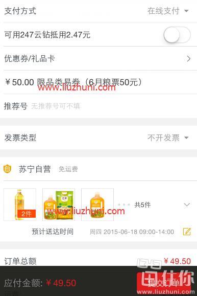 然后使用留住你推荐的粮油99-50优惠券,实付49.5元包邮到手,给家里囤货吧;如果大豆油没货,那么就凑单其他30元左右支持券的产品,例如玉米油1.8L的;