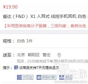 手慢无:奋达(F&D) X1 入耳式 线控手机耳机 19.9元