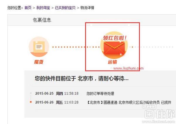 电脑上面打开天猫或者淘宝》》查看已买的宝贝(确认收货 和 正在发货)》》》点查看物流,有的会看到红包字样;如留住你(liuzhuni.com)下图所示;