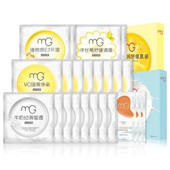 MG美即的这套组合包含:芦荟水酷补水面膜x10、海洋冰泉补水面膜x8、活氧温泉净化保湿面膜x2、(啤酒花)舒悦减压眼膜3对装;