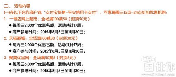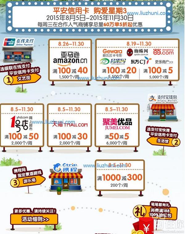 平安福利预告:1号店/亚马逊/天猫等 购爱星期三 订单结算再享100-50等
