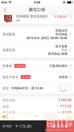 京东商城手机客户端特价至258.5元,可参与满100减30%的活动,加入购物车立减77.55元,再使用满100减5的优惠券,实付175.95元包邮,此前推荐最低227元。