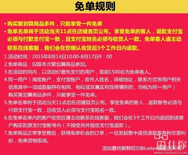 bluetex旗舰店旗舰店10点开启,活动价格为29元,前1500名可享受免单,同样是返现支付宝的形式,每人限免单1次;