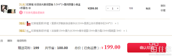 乐蜂网售价299元,参加满199-100的活动,满减后实付199元包邮到手,现在购买还送欧莱雅复颜3件套+欧莱雅清润5件套,算下来的话,唇釉一支还不用100,比专柜便宜了很多,同款京东售价149元/支,喜欢的盆友不妨看看;