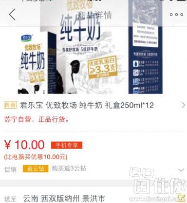 西南手慢无:君乐宝 优致牧场 纯牛奶 礼盒250ml*12 10元