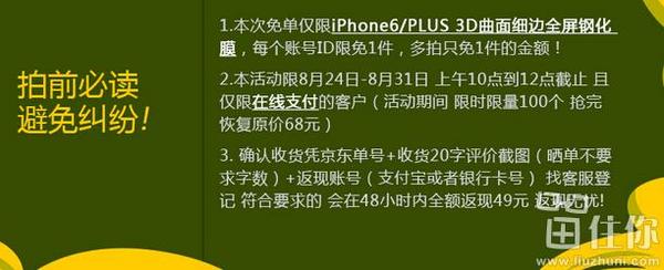 4.7寸iPhone6全覆盖钢化膜或者5.5寸plus手机钢化膜产品,目前49元在售,目前参加返现活动(活动介绍链接在此)。12点前在线支付成功,限100个名额,抢完后恢复68元的价格。