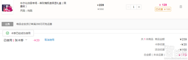 唯品会售价239元,下单立减100,再领取店铺20元优惠券(运费抵掉10元),实付129元包邮到手,价格非常合算,喜欢的盆友可以入手了;