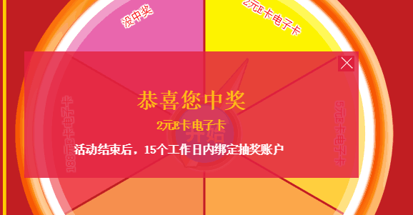 页面拉到底部即可参与抽奖,小编尝试了下是中了2块钱,提示15天内绑定到账户,这个卡相当于现金,大家可以试试;