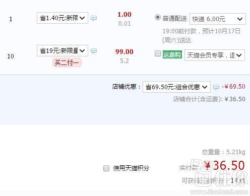 因为之前我站推荐过华南的20元券,这个时候结算就会自动使用上了,实付36.5元包邮到手,算下来非常划算哦,每提才3.6元~