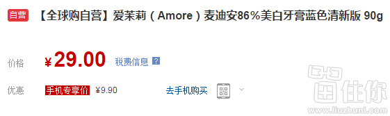 手慢无# Amore 爱茉莉 麦迪安86%美白牙膏 清新版90g 9.9元包邮