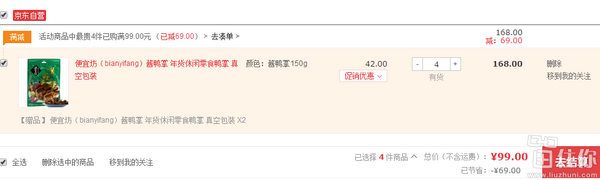 另外,便宜坊 酱鸭脖 真空包装150g,参加99元4件,还同时参加买1送1的活动,相当于99元购买8件,折12.4元/件;
