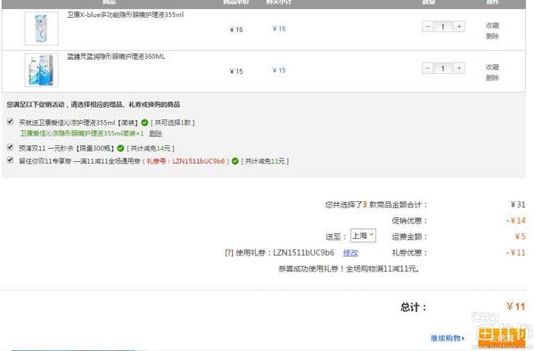 然后我们把蓝睛灵蓝润隐形眼镜护理液360ML一起加入购物车,价格会自动变为1元钱;