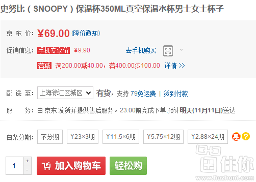 手慢无# SNOOPY 史努比 真空保温杯350ml 9.9元