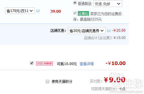天猫旗舰店售价39元,可以使用店铺20元优惠券,还能再叠加10元天猫购物券,实付9元包邮到手,手慢无!