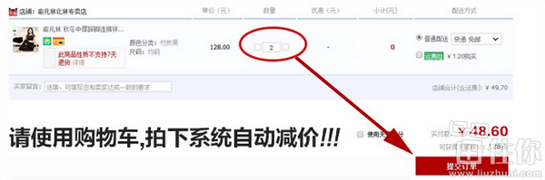 天猫商城售价39.8元包邮,第2条只需8.8元,下单2条,系统自动减掉31元,最终实付48.6元包邮,折合24.3元/条;