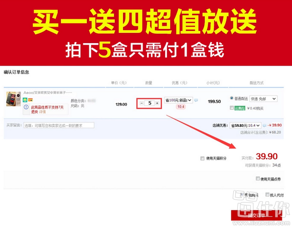 天猫商城售价39.9元,0点开始,前10000盒买1盒送4盒,拍5件,系统将自动改价,相当于39.9元买到25双袜子,算下来一双1.6元左右,非常实惠;