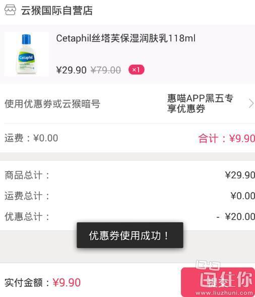 云猴全球购目前29.9元特价包邮中,在惠喵APP领取20元现金券后,去云猴全球购APP下单,即可享受9.9元包邮的价格,非常赞。