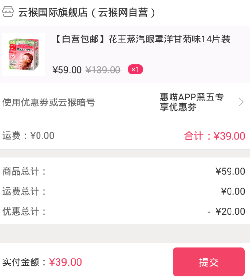 云猴网目前售价59元,在惠喵APP领取20元现金券后,去云猴全球购APP下单,实付39包邮到手,显然好价啦,喜欢的妹纸不要错过;